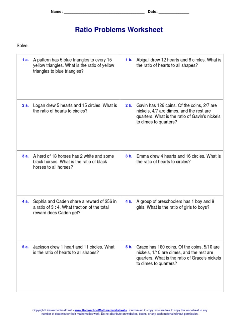Ratio Word Problems Worksheets - Math Worksheets 4 Kids These printable worksheets include simple theme-based ratio word problems, finding the ratio between two quantities, word problems that require children to find a part from the whole, part-to-part, a whole from the part, reading pictographs, bar graphs, and pie graphs. Click on the free icon to sample our worksheets.